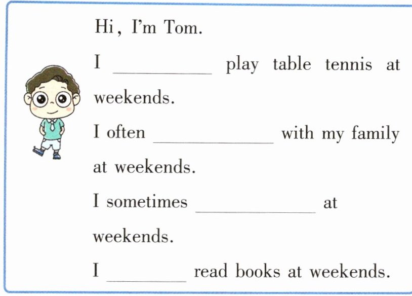 Mary: I like swimming. I 4. ______ go swimming with my friends at weekends. I sometimes go to the 5. ______ with my family.