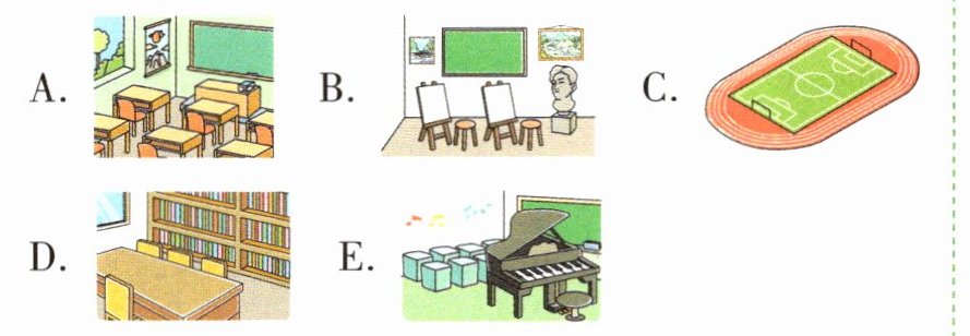 1. E; music room 2. B; art room 3. D; library 4. C; playground 5. A; classroom