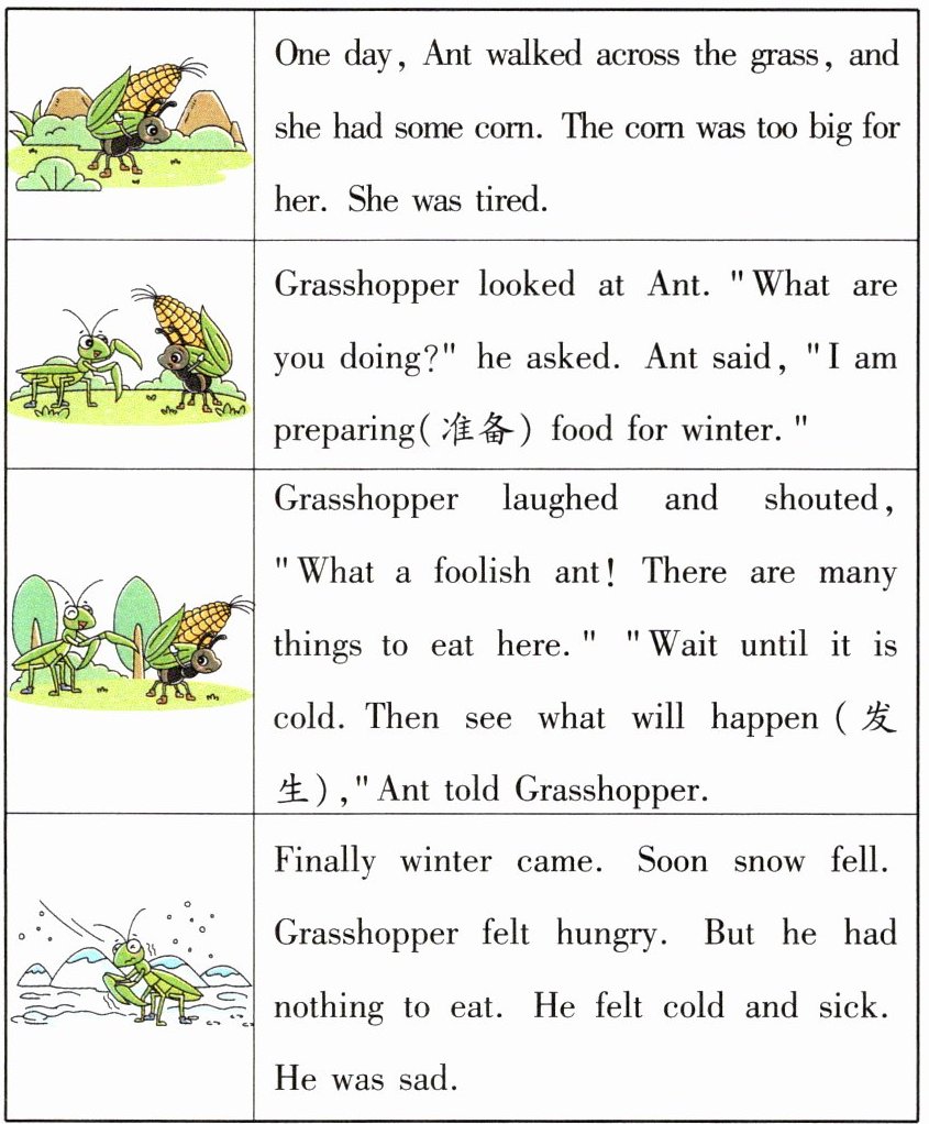 )4. Grasshopper was ____ in winter.A. happy and warm
