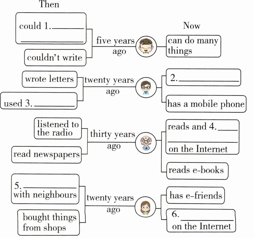 1. read and draw 2. sends emails 3. a telephone 4. watches news 5. made friends 6. does shopping