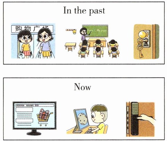In the past, people had to go to shops to buy things. Students always had lessons in the classroom and did homework on the paper. People usually opened the door with keys. Now people can do shopping on the Internet. Students can have lessons and hand in homework on the Internet too. And people have electronic locks. They can use their fingerprints to open the door.