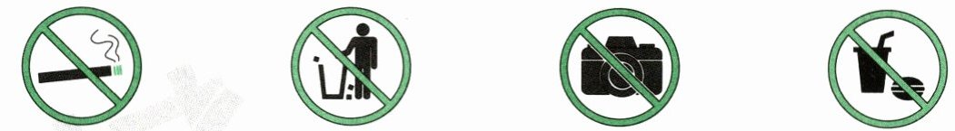 The second sign is " No littering". It means you shouldn't litter here. The third sign is " No photos". It means you can't take photos here. The fourth sign is " No eating or drinking". It means you can't eat or drink here.