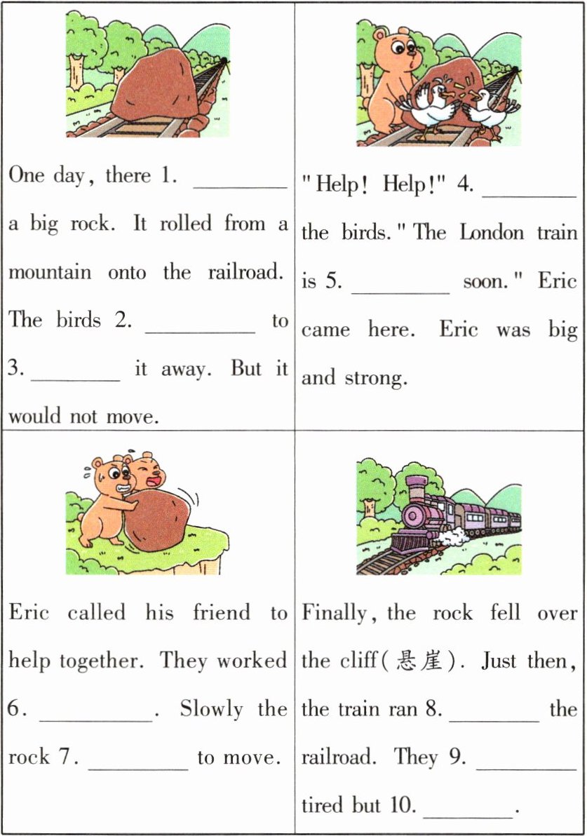任务一:1. was 2. tried 3. move 4. shouted 5. coming 6. hard 7. started 8. on 9. were 10. happy 任务二:1. F 解析 根据"One day ...a big rock. It rolled from a mountain onto the railroad"可知,一块大石头落在了火车轨道上,而不是落在了火车上。 2. F 解析 根据"But it would not move"可知,鸟儿们并没有挪走大石头。 3. T 4. T