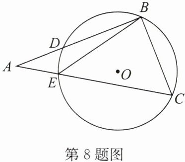 8. 如图,在Rt△ABC中,∠ABC= 90°,∠A= 32°,点B,C在⊙O上,边AB,AC分别交⊙O于点D,E,B是$\overset{\frown}{CD}$的中点,则∠ABE的大小是______