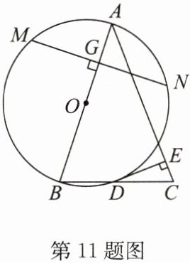 11. (2024·雨花区期末)如图,在$\triangle ABC$中,$AB= AC$,以 AB 为直径的$\odot O$与 BC 相交于点 D,$DE⊥AC$,垂足为 E.
