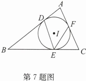 7.如图,$\odot I是\triangle ABC$的内切圆,D,E,F 为三个切点.若$∠DEF= 52^{\circ }$,则$∠A$的度数为(