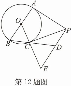12.如图,AB 为$\odot O$的直径,PA,PC 分别与$\odot O$相切于点 A,C,$PE⊥PA$,PE 交 OC 的延长线于点 E.