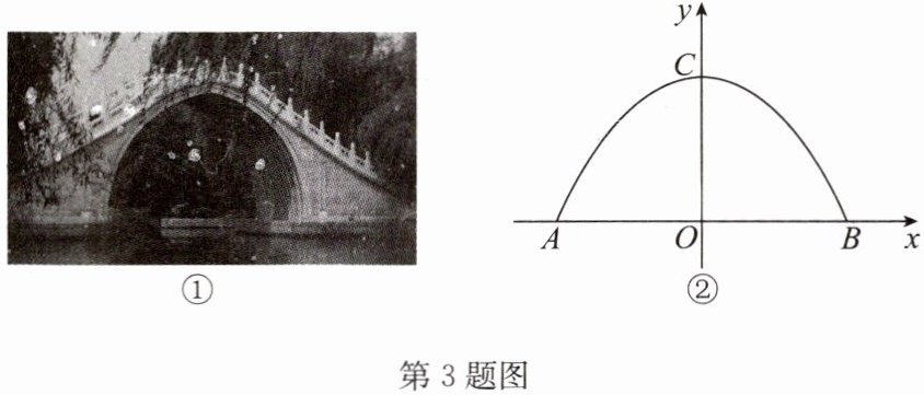 3. 如图①,单孔拱桥的形状近似于抛物线,建立如图②所示的平面直角坐标系,在正常水位时,水面宽度 AB 为 12 m,拱桥的最高点 C 到水面 AB 的距离为 6 m.