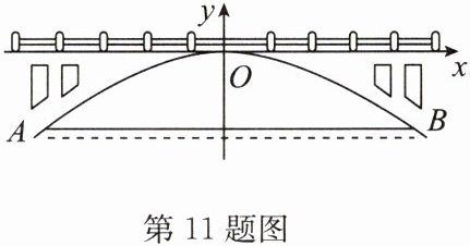 11. (2023·中原区模拟)一座抛物线形拱桥如图所示,当桥下水面宽度$AB为20m$时,拱顶点$O距离水面的高度为4m$. 如图,以点$O$为坐标原点,以桥面所在直线为$x$轴建立平面直角坐标系.