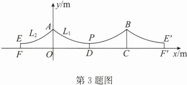 3. (2024·陕西)一条河上横跨着一座宏伟壮观的悬索桥.桥梁的缆索$L_{1}与缆索L_{2}$均呈抛物线形,桥塔AO与桥塔BC均垂直于桥面,如图,以O为原点,以直线$FF'$为x轴,以桥塔AO所在直线为y轴,建立平面直角坐标系.已知缆索$L_{1}所在抛物线与缆索L_{2}$所在抛物线关于y轴对称,桥塔AO与桥塔BC之间的距离$OC = 100m$,$AO = BC = 17m$,缆索$L_{1}$的最低点P到$FF'的距离PD = 2m$. (桥塔的粗细忽略不计)