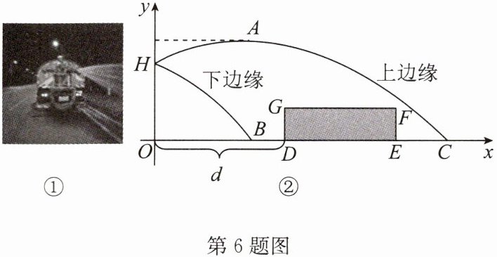 6. (2024·江都区期末)如图①是洒水车为绿化带浇水的场景.洒水车喷水口H离地竖直高度OH为1.2m,喷出的水的上、下边缘近似地看作两条抛物线,下边缘抛物线是由上边缘抛物线向左平移得到的,上边缘抛物线最高点A离喷水口的水平距离为2m,高出喷水口0.4m.把绿化带横截面抽象为矩形DEFG,绿化带的水平宽度$DE = 3m$,竖直高度$EF = 0.6m$.洒水车到绿化带的距离OD为d(单位:m),建立如图②所示的平面直角坐标系.