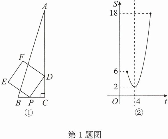 (2)当点$P由点B运动到点A$时,经探究发现$S是关于t$的二次函数,并绘制成如图②所示的图象.请根据图象信息,求$S关于t的函数解析式及线段AB$的长.