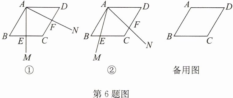 6. 如图,已知一个锐角等于$60^{\circ }的菱形ABCD$,将一个$60^{\circ }的∠MAN的顶点与该菱形的顶点A$重合,以点$A$为旋转中心,按顺时针方向旋转这个$60^{\circ }的∠MAN$,使它的两边分别交$CB,DC或它们的延长线于点E,F$.
