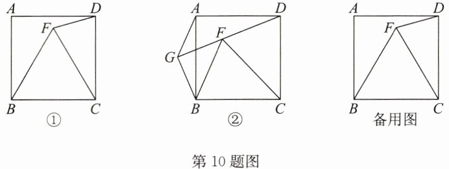 10. (2024·海安期末)如图①, 已知四边形 $ ABCD $ 是正方形, 将线段 $ CD $ 绕点 $ C $ 逆时针旋转得到线段 $ CF $, 旋转角为 $ \alpha(0^{\circ} < \alpha < 90^{\circ}) $, 连接 $ BF $, $ DF $.