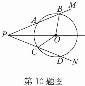 10. 如图,O是$\angle MPN$平分线上一点,以点O为圆心的圆和PM,PN分别交于点A,B,C,D.求证:$\angle OBA= \angle OCD$.