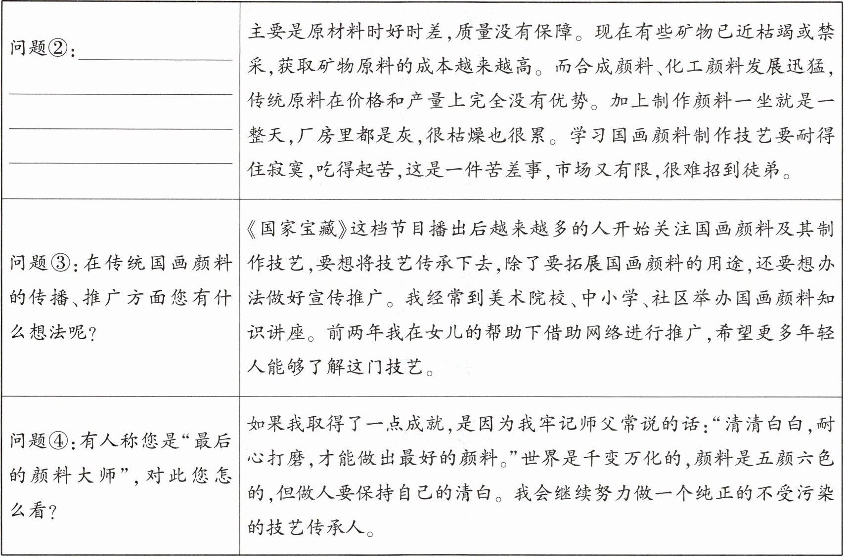 | 问题②:______ | 主要是原材料时好时差,质量没有保障。现在有些矿物已近枯竭或禁采,获取矿物原料的成本越来越高。而合成颜料、化工颜料发展迅猛,传统原料在价格和产量上完全没有优势。加上制作颜料一坐就是一整天,厂房里都是灰,很枯燥也很累。学习国画颜料制作技艺要耐得住寂寞,吃得起苦,这是一件苦差事,市场又有限,很难招到徒弟。 |