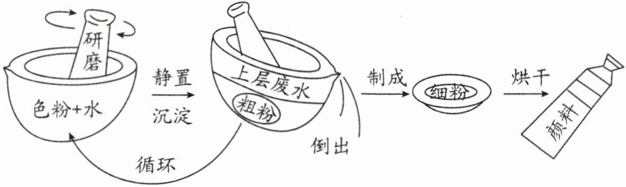 3. 示例:第一步,色粉加水研磨;第二步,静置、沉淀后倒出上层废水,得到粗粉;第三步,粗粉再加水研磨,然后静置、沉淀,倒出上层废水,循环反复多次后制成最后的细粉;第四步,把细粉烘干,制成颜料并装入颜料瓶。