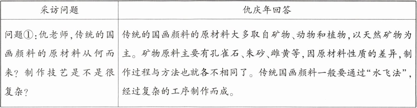 | 问题①:仇老师,传统的国画颜料的原材料从何而来?制作技艺是不是很复杂? | 传统的国画颜料的原材料大多取自矿物、动物和植物,以天然矿物为主。矿物原料主要有孔雀石、朱砂、雌黄等,因原材料性质的差异,制作过程与方法也就各不相同了。传统国画颜料一般要通过“水飞法”,经过复杂的工序制作而成。 |