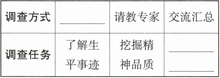 | 调查任务 | 了解生平事迹 | 挖掘精神品质 | ______ |