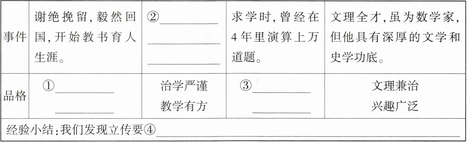 | 事件 | 谢绝挽留,毅然回国,开始教书育人 生涯。 | ②______ | 求学时,曾经在 4 年里演算上万道题。 | 文理全才,虽为数学家,但他具有深厚的文学和史学功底。 |