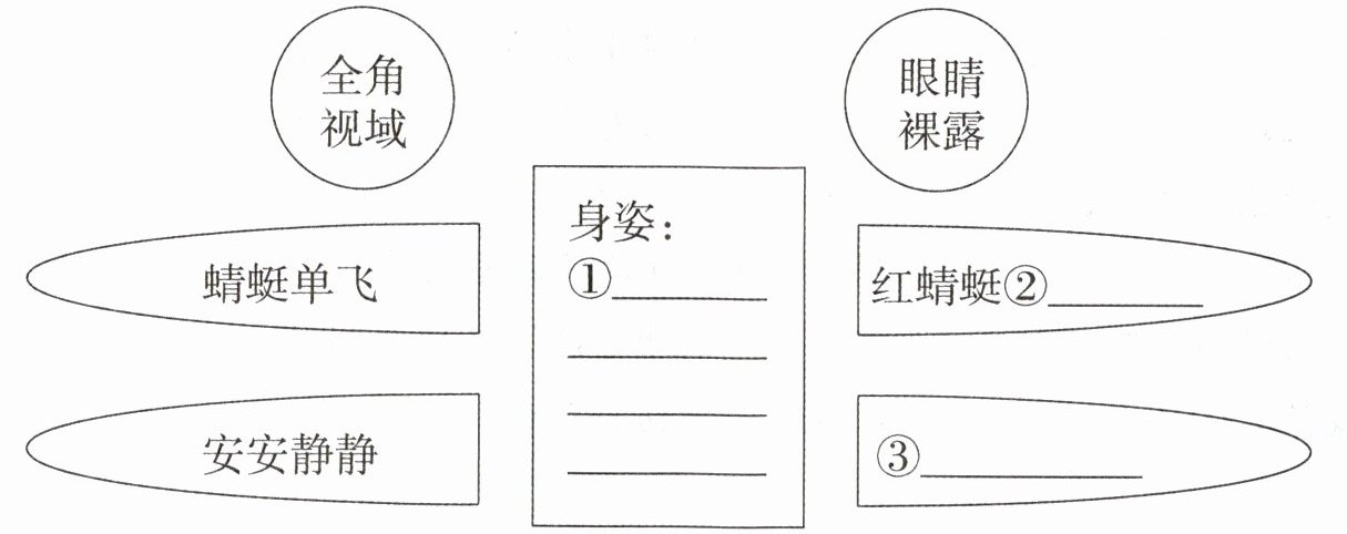 5. 请根据课文内容,补写图内三处关于蜻蜓的特点。(3 分)