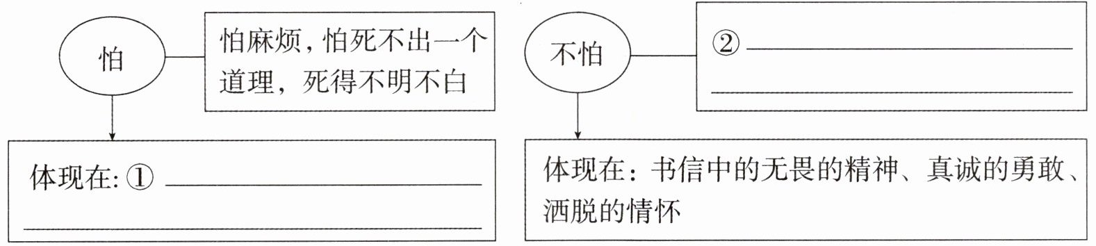 6. 文章第④段画线句“他真的害怕了吗?也是也不是”。苏东坡害怕的是什么,不怕的是什么?怕与不怕的行为体现各是什么?结合文章内容,完成下图。(2 分)