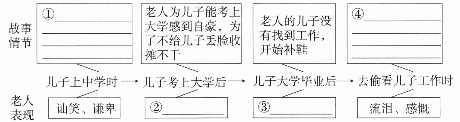 3. ①老人在儿子学校门口补鞋,却遭到儿子嫌弃 ②脸上荡漾着光辉 ③没脸见人 ④老人的儿子坦然地对待工作