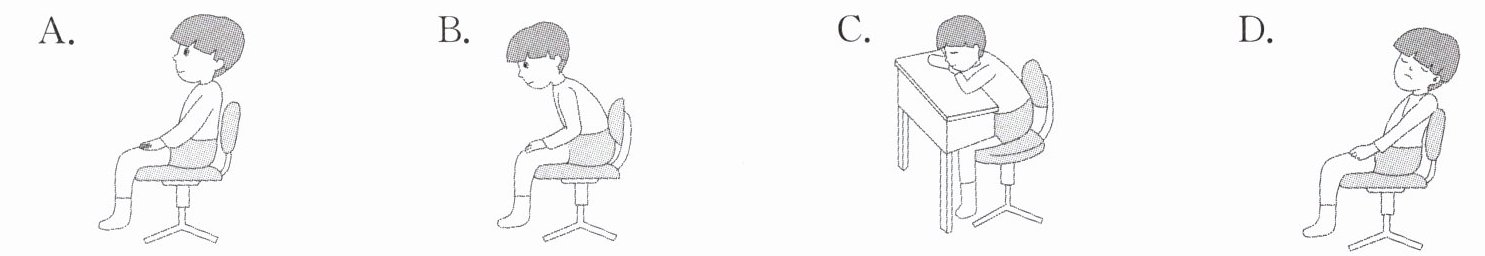 1题:根据文章第二段“The posture is sitting up straight and it can help students do better in Maths exams.”可知,坐直可以帮助学生在数学考试中表现得更好,即感觉压力更小。然后看选项中的插图,A选项是坐直,B选项身体前倾,C选项趴在桌子上,D选项靠在椅子上。所以答案是A。