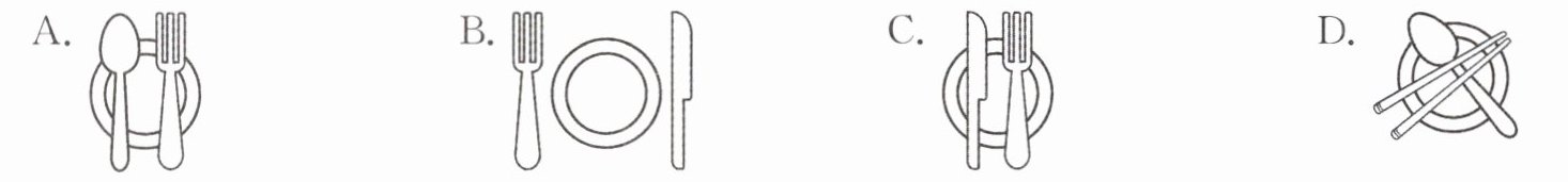D选项:图片中盘子上交叉放着一把勺子和一双筷子,不符合题意。