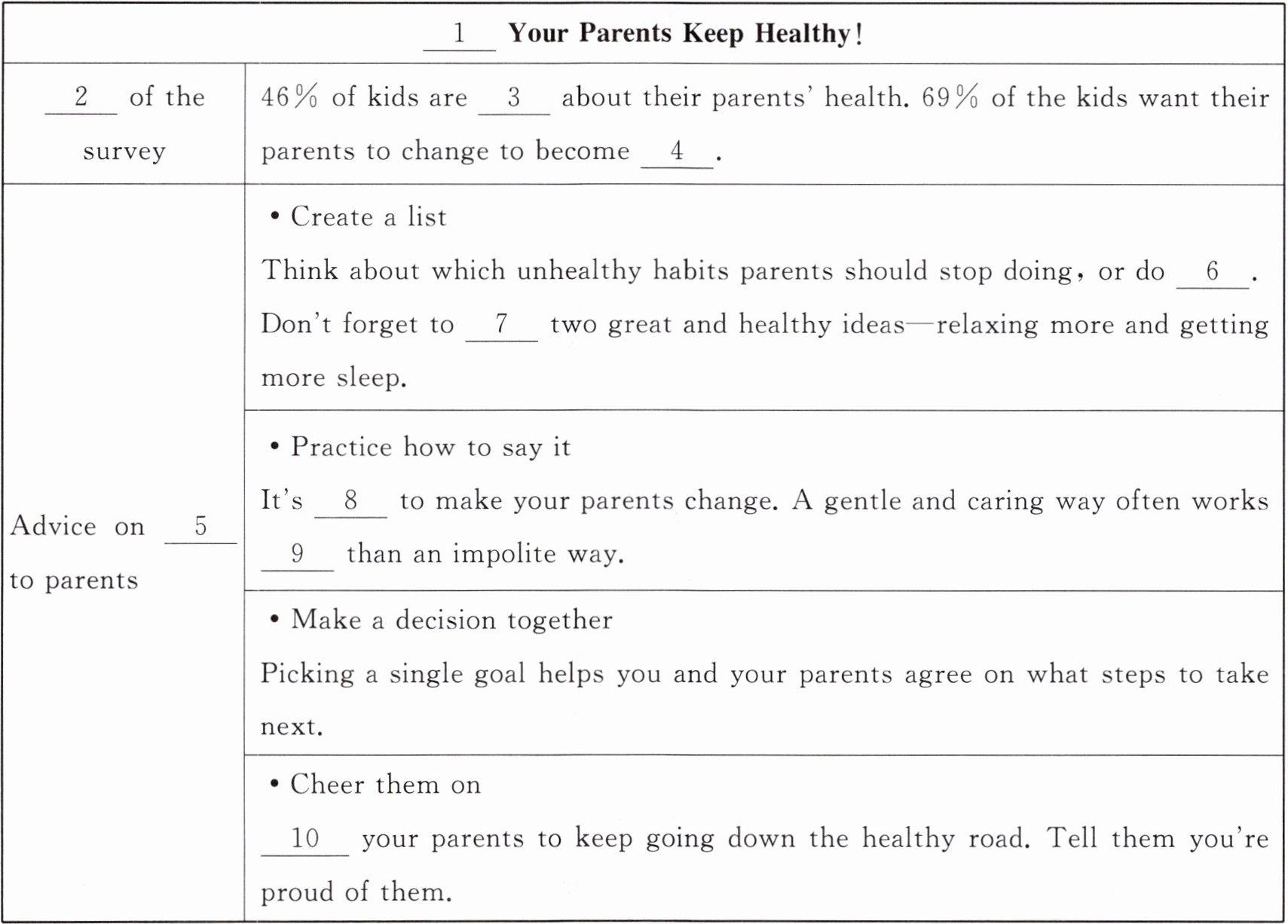 1. 首先,通读短文,了解文章主旨是关于如何帮助父母保持健康。