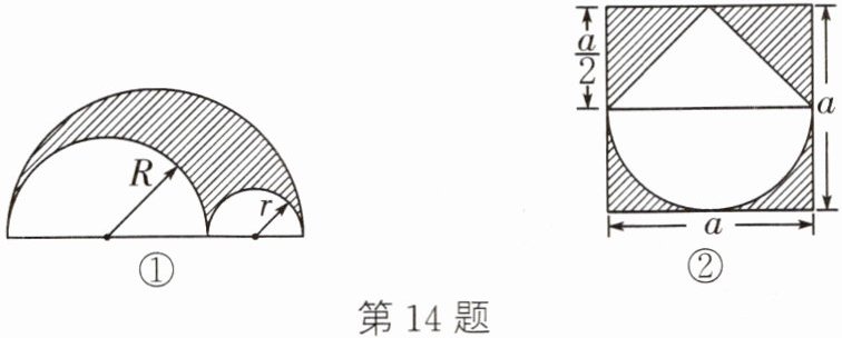 ①$\dfrac{1}{2}\pi(R+r)^{2}-\dfrac{1}{2}\pi R^{2}-\dfrac{1}{2}\pi r^{2}$ ②$a^{2}-\dfrac{1}{4}a^{2}-\dfrac{1}{8}\pi a^{2}$
