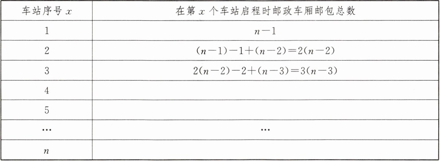 (2)根据上表,写出列车在第x个车站启程时,邮政车厢上共有邮包的个数y(用含x、n的代数式表示).