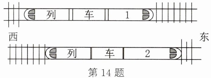 14.两辆列车如图所示,列车2上的乘客看到列车1正在向东行驶。如果以地面为参照物,下