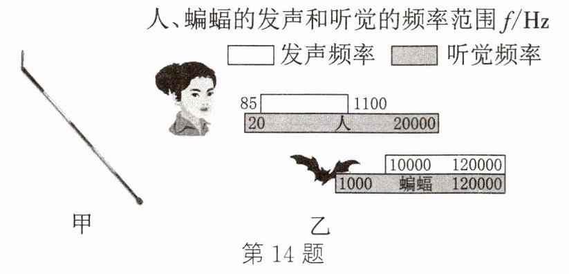 14. 如图甲的导盲杖说明书如下表所示,导盲杖发出的声遇到障碍物后反射回来,手柄接收回波后通过振动提醒盲人前方有障碍物。人、蝙蝠发声和听觉频率范围如图乙所示。(15℃时声速为340 m/s)