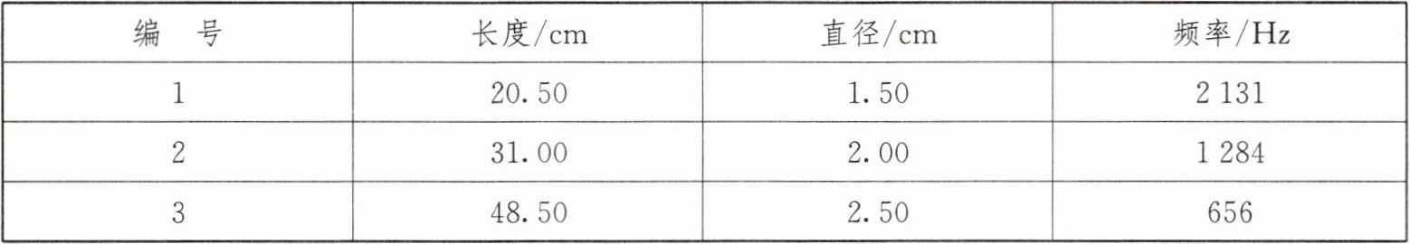 |编号|长度/cm|直径/cm|频率/Hz|