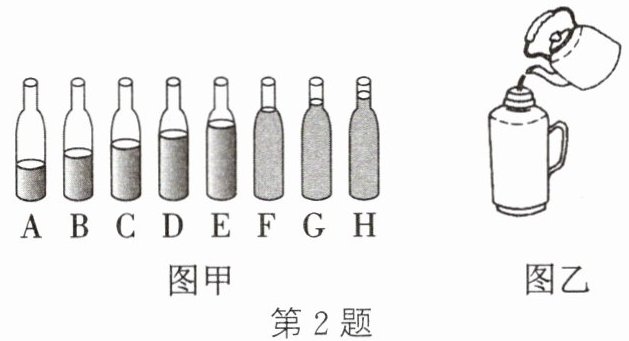 2. 如图甲,在八个相同的玻璃瓶中,装入质量不同的水,水面的高度不等。