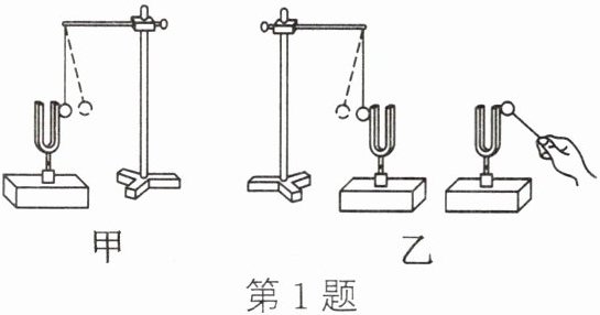 1. 如图甲所示,用竖直悬挂的泡沫塑料球接触正在发声的音叉时,泡沫塑料球被弹起,这个现象说明发声的物体在振动,这种研究方法叫作转换法;如图乙所示,敲击右边的音叉,左边完全相同的音叉把泡沫塑料球弹起,这个现象说明空气可以传声。