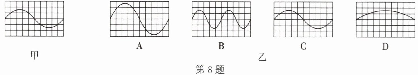 8. 当声音的音调、响度或音色不同时,示波器上所显示的波形也会不同。如图甲为用力敲击256Hz的音叉后在示波器上所显示的波形。那么用更大的力敲同一音叉时发出更响亮的声音,在图乙A、B、C、D四幅图中,示波器上所显示的是B图所对应的波形,B图比图甲中的声音的音调要高,四幅图中声音的音色相同(相同/不同)。若对面教室的同学大声敲音叉影响到你,为了控制噪声,你可以采用的做法是关闭门窗(合理即可)。