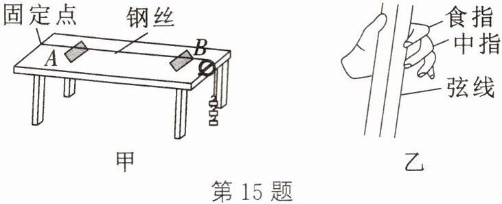 15. 为了研究同一根钢制琴弦发声音调与哪些因素有关,可利用图甲所示实验装置。一块厚木板上有A、B两个楔支撑着琴弦,其中A楔固定,B楔可沿木板移动以改变琴弦振动部分的长度L。将钢制琴弦的末端固定在木板一端,另一端通过滑轮悬挂不同个数的相同重物,重物个数越多,琴弦绷得越紧。轻轻拨动琴弦,在A、B间产生振动,并用仪器测出发声频率。