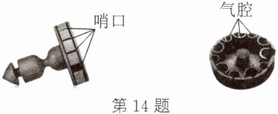 14. 宋代《梦粱录》中记载了一项中国民间传统游戏——抖空竹。如图所示,在竹木制成的空竹圆轮外侧开有若干方形哨口,哨口内有大小不同的气腔,转动时会发出嗡嗡声。关于空竹发出的声音,下列说法正确的是( )