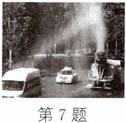 7. 为了使城市空气更加清洁,环卫处经常向空中喷洒水雾,如图所示是环卫喷雾车作业后空中出现的彩虹,这是光的色散现象。天空出现的彩虹,可以说明太阳光是一种复色光(单色光/复色光)。