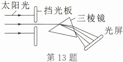 13. 如图所示,让一束太阳光通过挡光板的狭缝照射到三棱镜的一个侧面上,用光屏接收从三棱镜的另一侧出射的光线。