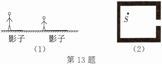 13. (1)如图(1),路灯下站着小明和小华两人,地上留下了他们的影子,请你通过作图确定路灯灯泡S的位置。