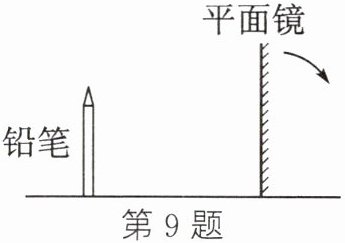 9. 如图所示,铅笔和平面镜均竖直放置在水平面上,铅笔与平面镜之间的距离为15 cm,则铅笔与它的像之间的距离为______cm,铅笔和平面镜均水平向右移动,且移动速度为2∶1,则铅笔像的大小将______(不变/改变),若想让铅笔的像与铅笔垂直,则可将平面镜绕底边顺时针旋转______。