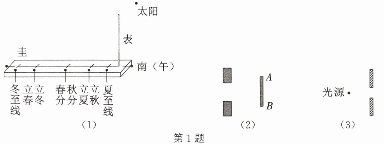 (1)圭表通过直立于地面的杆,记录正午时影子长短变化来确定季节的变化,在图(1)中画出表在圭上形成影子的光路(黑点代表太阳)。