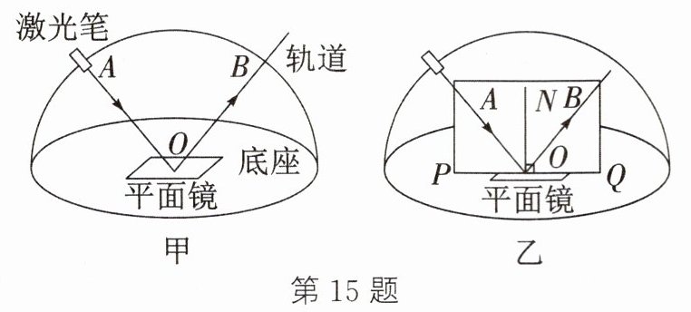 15. (2024·镇江)小红用图甲所示装置探究光的反射定律,平面镜置于水平底座中心,激光笔可沿弧形轨道移动,且保持激光始终射向平面镜上的O点。