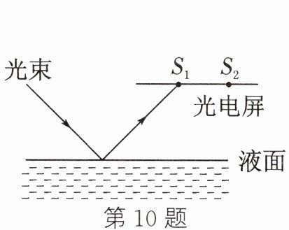 10. 有一光电控制液面高度的仪器,通过光束在液面上的反射光线打到光电屏上来显示液面高度,光路图如图所示。当入射光方向不变,光电屏上的点从$S_1$移到$S_2$时,表示液面 (上升/不变/下降),若此时入射光束与液面的夹角是40°,则反射角的大小是 。