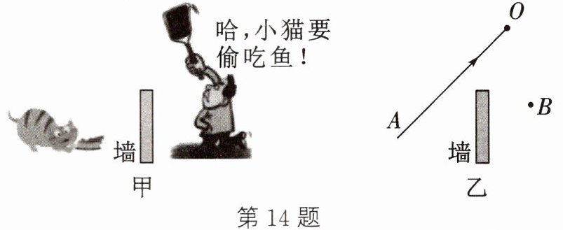 14. (2024·成都)如图甲,小孟利用一面小镜子隔墙看到院里的小猫要偷吃鱼。如图乙所示,AO表示来自小猫的入射光线,O点为入射点,B点为小孟眼睛所在位置。请在图乙中完成作图:① 画出反射光线OB。② 根据光的反射定律画出镜面。(镜面用 表示,保留作图痕迹)