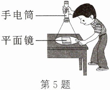 5. 为探究光的反射,小明在黑暗的房间里进行了如下实验:在一张表面粗糙的水平桌面上放一个平面镜,让手电筒的光从上往下正对着平面镜照射,如图所示。小明发现:从上往下看时,平面镜比桌面亮;从侧面看时,桌面比平面镜亮。下列说法正确的是( )