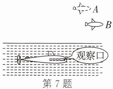 7. 如图所示,A、B两架飞机,B是实际飞机,A是从潜水艇上观察到的该飞机的______(实/虚)像,这是因为光从______(水斜射入空气/空气斜射入水)中时发生了折射。从观察口发一束激光,要想射中飞机,应该对准______(A/B)。